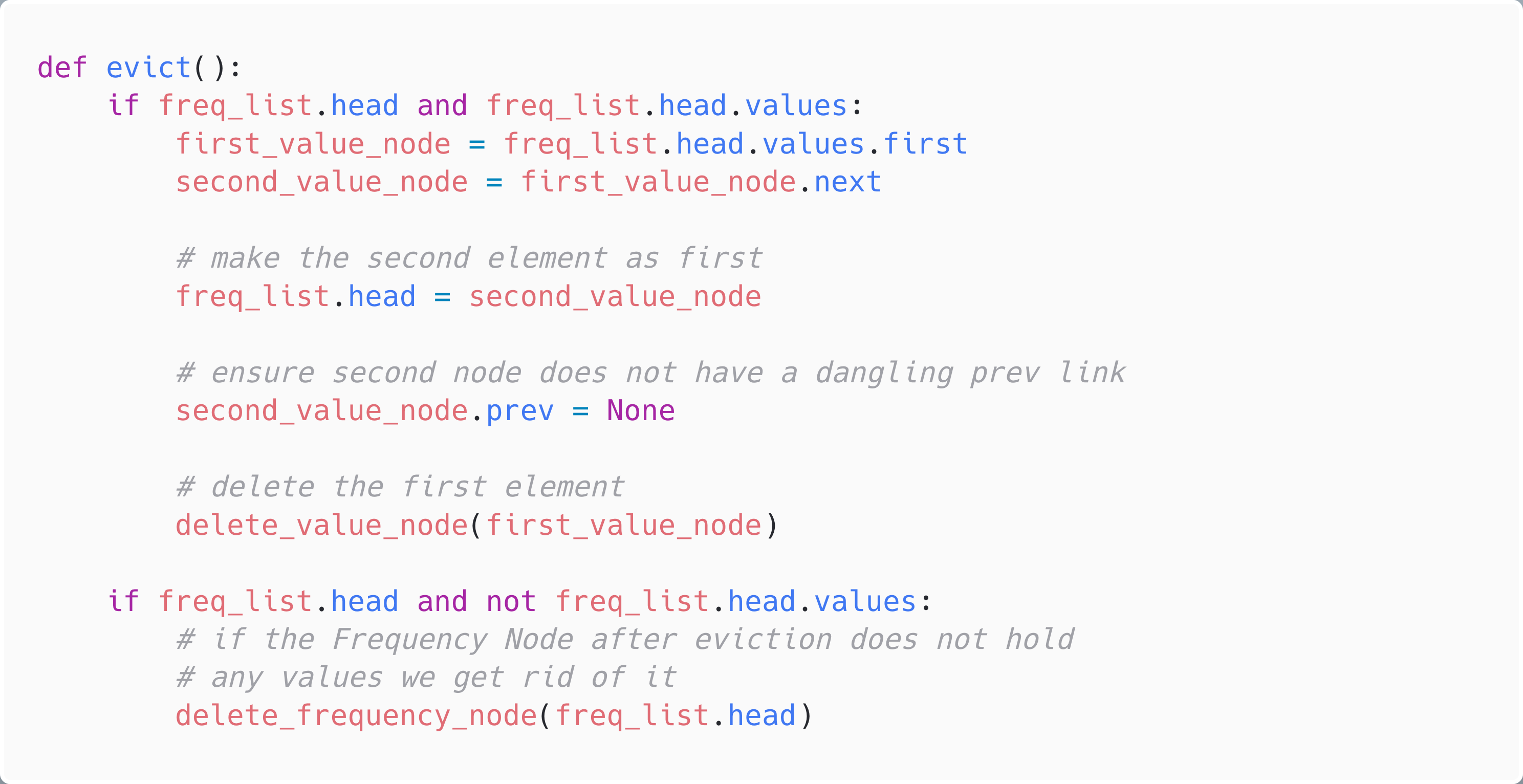 Eviction, similar to insertion, is a trivial operation where we simply pick the frequency node with lowest access frequency (the first node in the freq_list) and remove the first Value Node present in its values_list. Since the entire eviction also requires pointer manipulations, it also exhibits a running complexity of O(1).