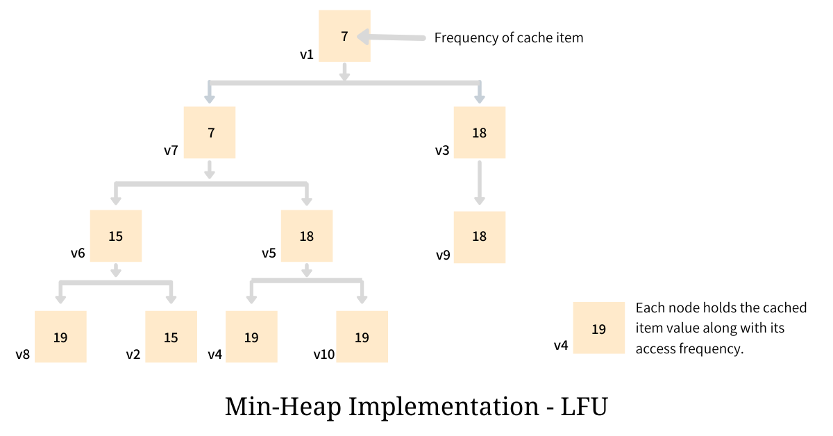 Although the identification of the element to be evicted is quick, but in order for the heap to maintain its property - element with lowest access frequency be at the top - it demands a rebalance, and this rebalancing process has a running complexity of O(log n). To make things worse, rebalancing is required every single time the frequency of an item is changed; which means that in the cache that implements LFU, every time an item is either inserted, accessed or evicted, a rebalance is required - making all the three core operations to have the time complexity of O(log n).