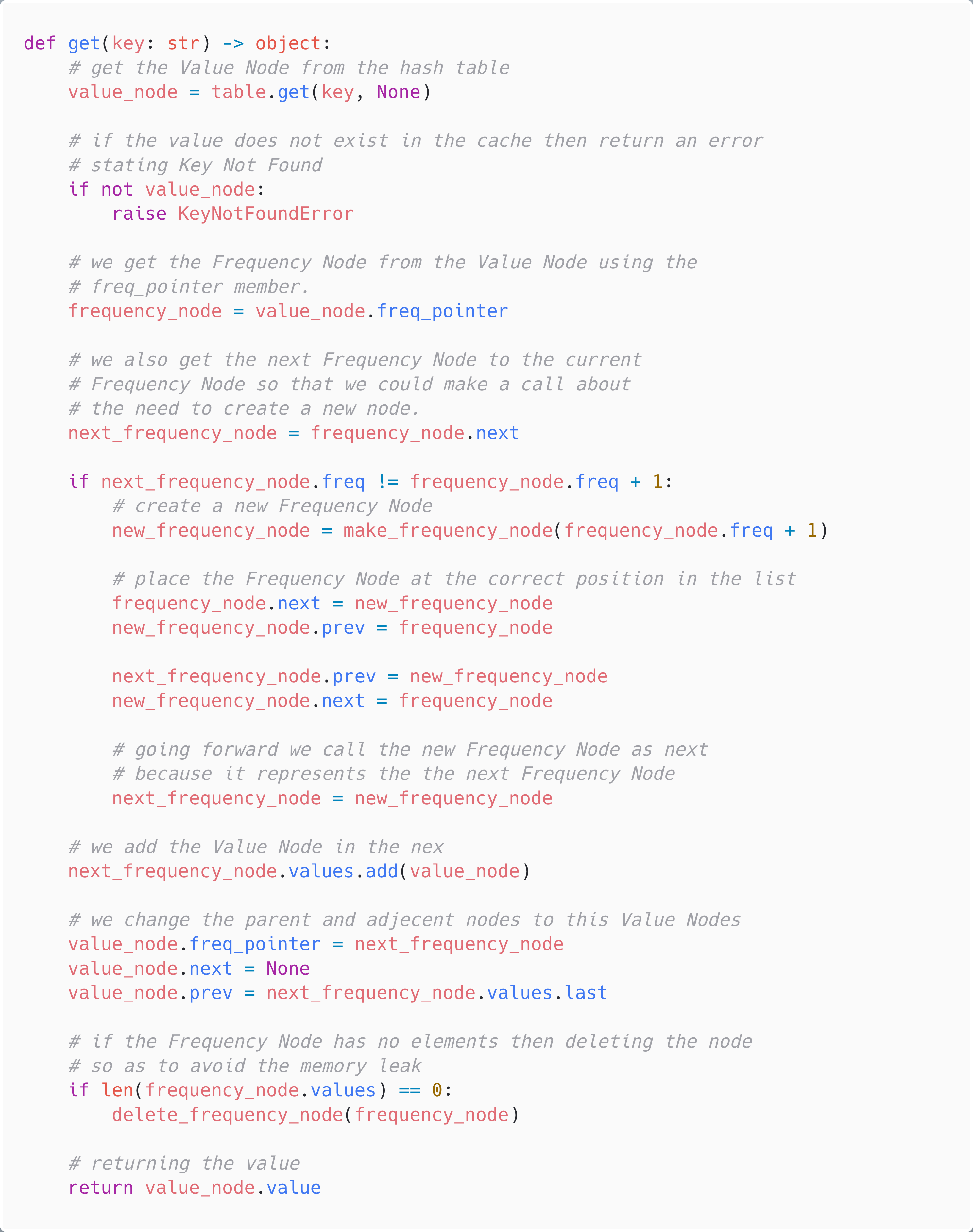 Accessing an item from the cache has to be the most common operation of any cache. In the LFU scheme, before returning the cached value, the engine also has to update its access frequency. Ensuring the change in access frequency of one cached value does not require some sort of rebalancing or restructuring to maintain the integrity, is what makes this implementation special.