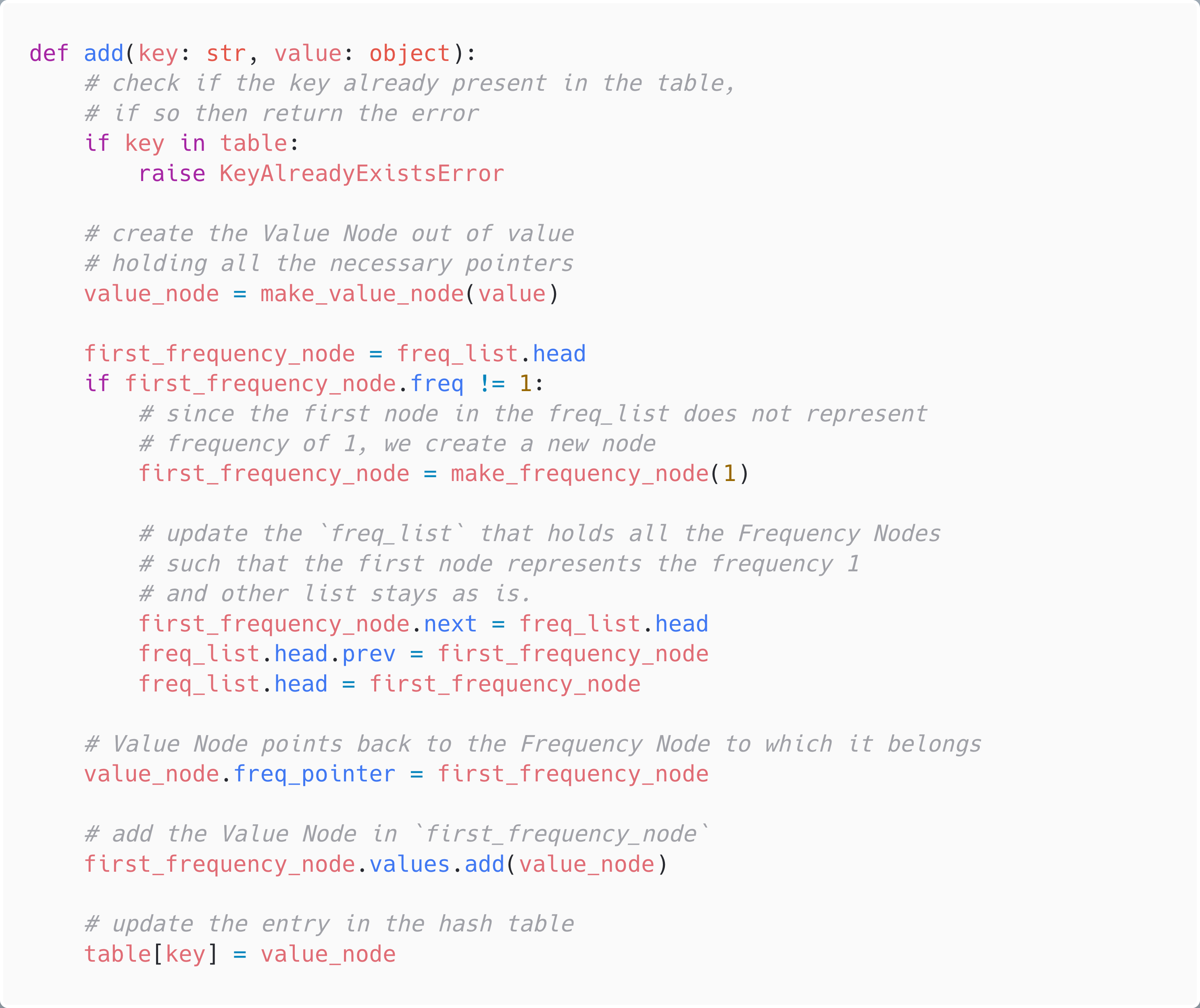 Adding a new value to the cache is a relatively simpler operation that requires a bunch of pointer manipulations and does the job with a constant time running complexity. While inserting the value in the cache, we first check the existence of the key in the table, if key is already present and we try to put it again the function raises an error. Then we ensure the presence of the Frequency Node representing the frequency of 1, and in the process, we might also need to create a new frequency node also. Then we wrap the value in a Value Node and adds it to the values_list of this Frequency Node; and at last, we make an entry in the table acknowledging the completion of the caching process.